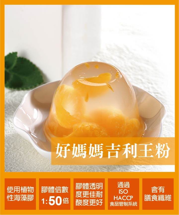 嚴選無汙染海藻所生產製成,為植物性海藻膠,其口感與性質有別於洋菜粉與動物膠(吉利丁),可廣泛應用於製作布丁、果凍、奶酪類產品、含膳食纖維為植物性產品、耐酸性佳、成品透明度高,凝結時間短,不需完全冷卻即可放入冰箱冷藏。