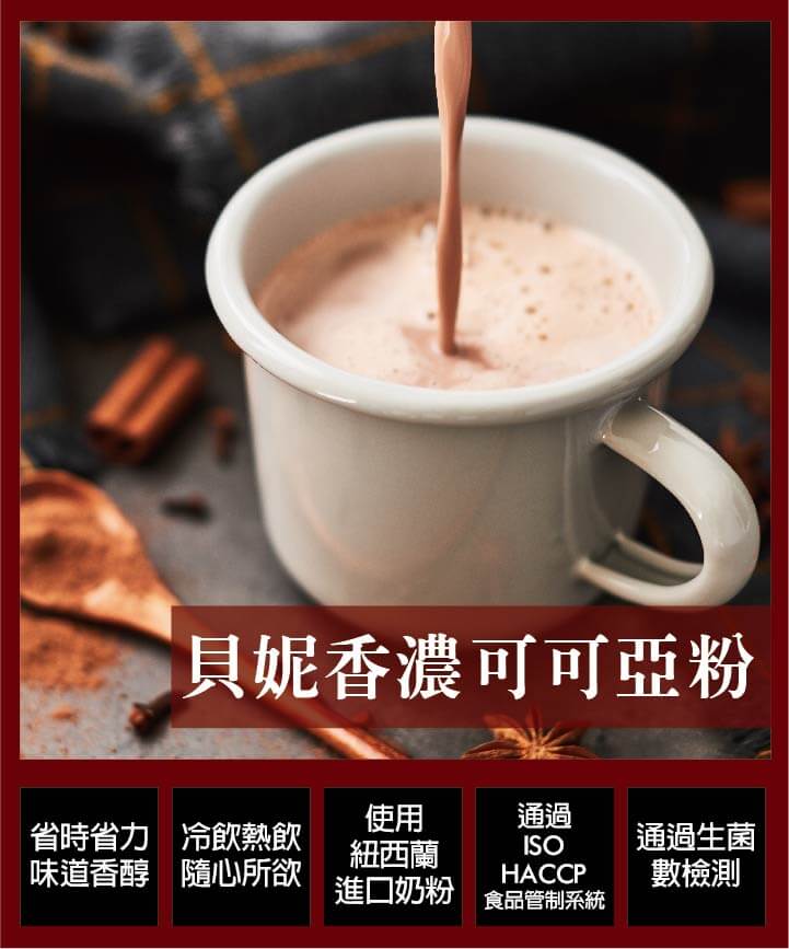嚴選來自迦納西非的可可豆種,經過長時間發酵而散發細緻圓滑的風味,搭配紐西蘭進口奶粉的黃金比例特調配方,可直接沖泡成特調可可亞飲品,省時省力味道濃醇香郁。