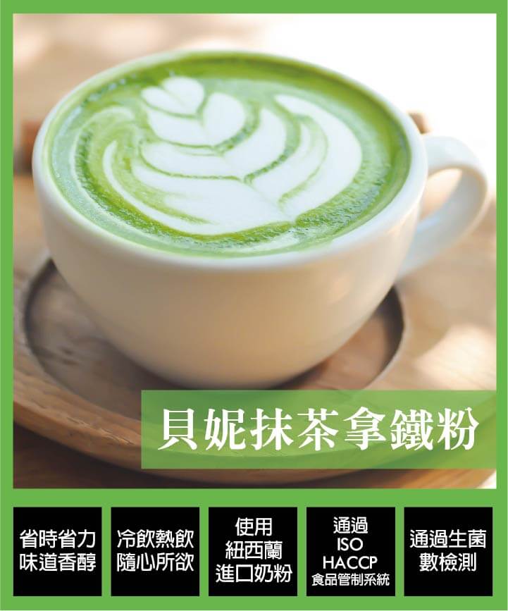 •單杯沖泡:加入一匙抹茶拿鐵粉(20公克)於150毫升熱開水中攪拌均勻即可飲用。(比例可自行調整)